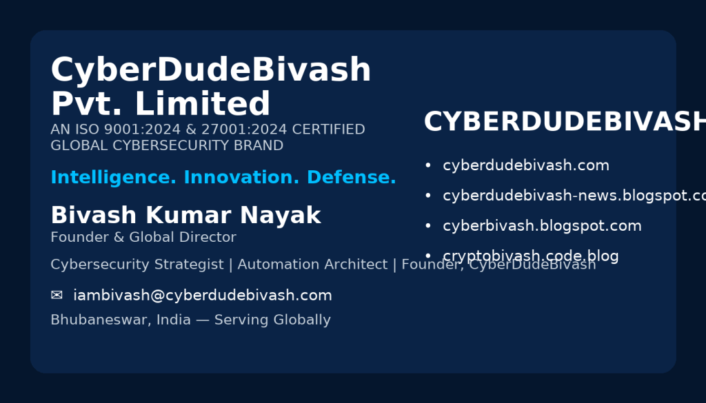 CyberDudeBivash stands for world-class cybersecurity, AI-driven automation, and proactive digital defense — trusted by global professionals and enterprises alike.